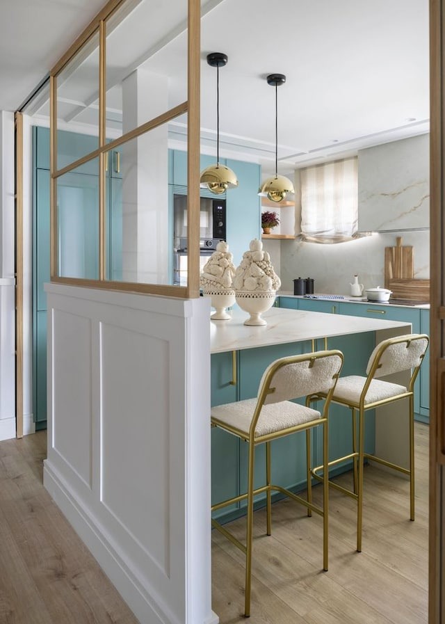 Cuando la cocina se comunica con el salón o el comedor mediante un panel acristalado, la encimera puede prolongarse hasta el cristal y funcionar como barra de desayuno. Esta solución, que propone la interiorista Laura Martínez, conecta visualmente ambos ambientes y potencia la luminosidad.
