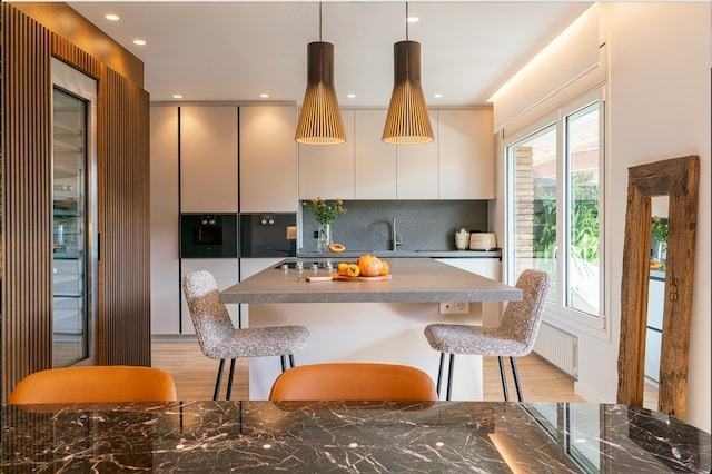 Algunos rincones sorprenden por su ingenio. Imagina una barra de desayuno que desaparece al bajar un panel donde se proyecta una película. Este diseño de Brákara Studio convierte el mismo espacio en un área multifuncional: por el día, un lugar para desayunar; por la noche, una pequeña sala de cine doméstica.