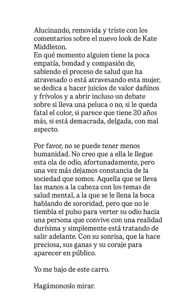 A través de sus redes sociales, la periodista publicó un mensaje contundente en el que criticó la falta de sensibilidad de ciertos usuarios. “Alucinando, removida y triste con los comentarios sobre el nuevo look de Kate Middleton. ¿En qué momento alguien puede mostrar tan poca empatía, bondad y compasión sabiendo el proceso de salud que ha atravesado o atraviesa esta mujer? Y aun así, se dedica a emitir juicios de valor dañinos y frívolos, debatiendo si lleva peluca o no, si el color le queda mal, si parece mayor, si está demacrada o delgada”, comenzó diciendo.