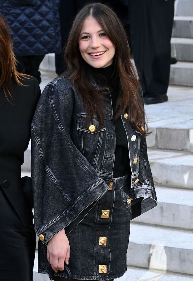 Juliette, en cambio, añadió un toque juvenil con un conjunto de chaqueta y minifalda en tela envejecida con botones dorados, complementado con un jersey de cuello alto negro y medias semitransparentes. Completó su look con botines y un bolso pequeño negro, manteniendo la paleta de colores de su madre, pero aportando un aire moderno propio.