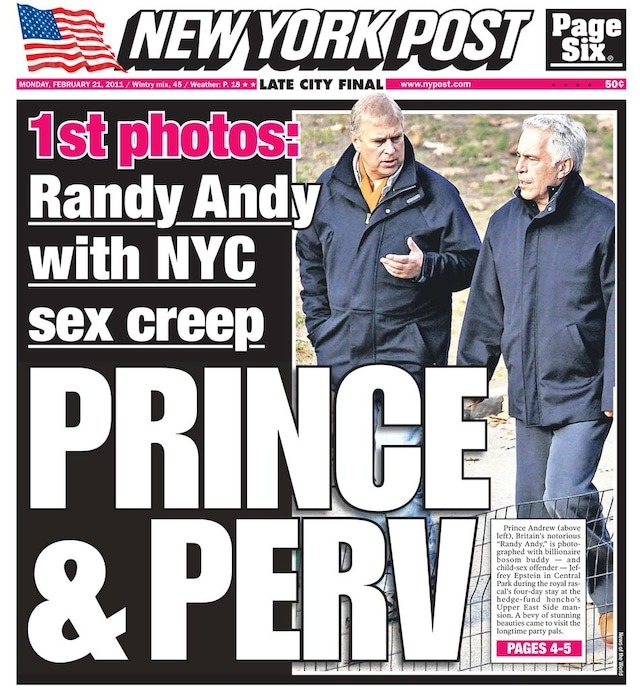 Giuffre sostiene que fue contratada como masajista por Epstein y que viajó por todo el mundo para reunirse con hombres por orden suya cuando tenía 17 y 18 años. Asegura que la obligaron a mantener relaciones sexuales con el príncipe Andrés en tres ocasiones, y que fue presentada a él en marzo de 2001 mientras se alojaba en la casa de Maxwell cerca de Hyde Park, en Londres.