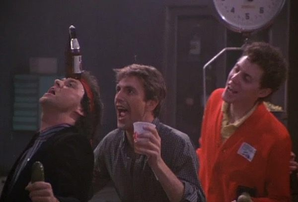 Kevin Costner aparece como un chico de una fraternidad universitaria en una fiesta dentro del depósito de cadáveres. No tiene diálogo, pero puedes verlo con una camisa a cuadros, un cárdigan universitario atado a la cintura y una taza en la mano, simplemente pasando el rato mientras Michael Keaton hace de las suyas equilibrando una botella sobre la cabeza.