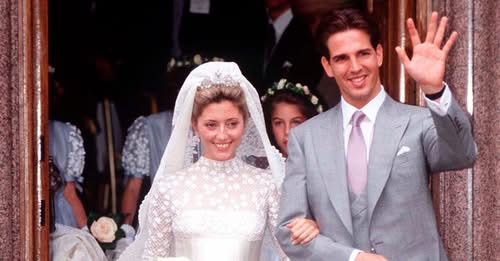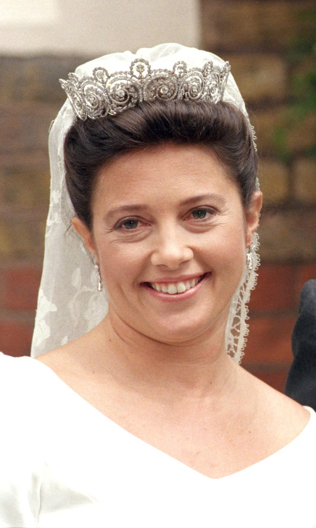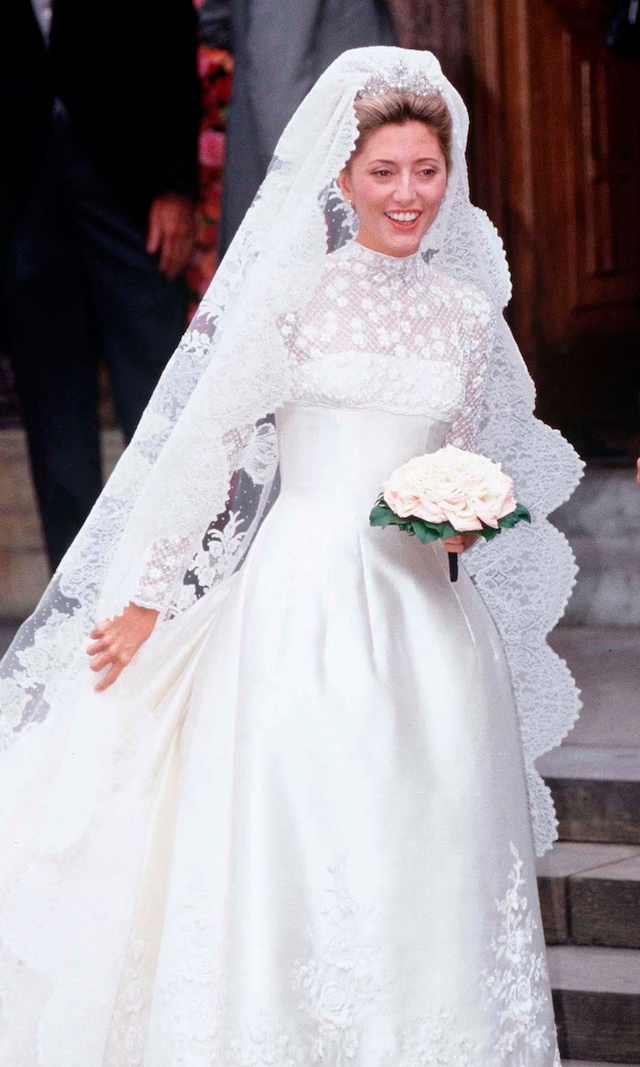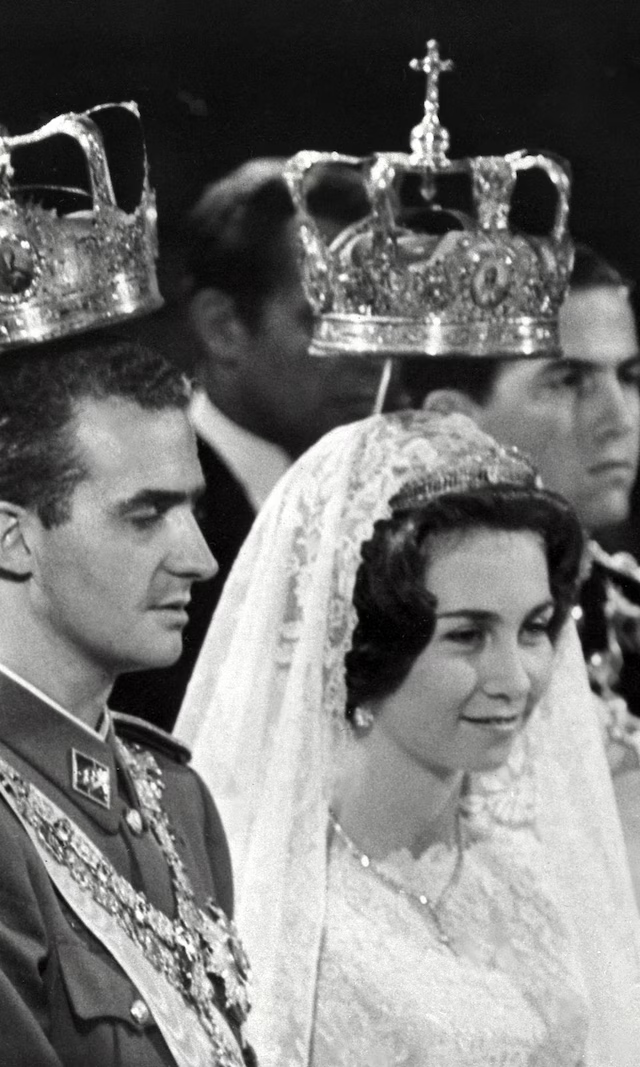 • El vestido: Diseñado por Jean Dessés, con cuerpo ajustado, falda voluminosa de lamé y tul bordado en encaje antiguo, incluyendo el manto y los zapatos. Lució la tiara prusiana de su abuela, que también usaría la reina Letizia décadas después.