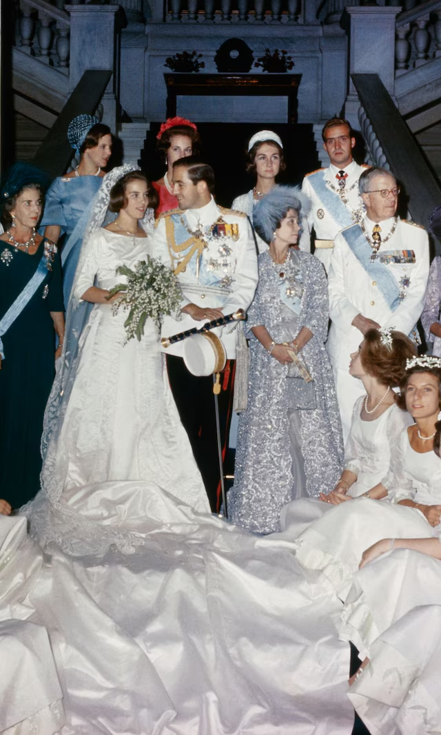 • El vestido: Creación de Celia Kritharioti, silueta clásica con cuerpo ceñido y falda voluminosa con bordados florales. Escote Bardot poco habitual en la realeza. Completó el look con velo de encaje irlandés y tiara jedive de Egipto, además de pendientes de diamantes y pulsera de la reina Alejandrina.