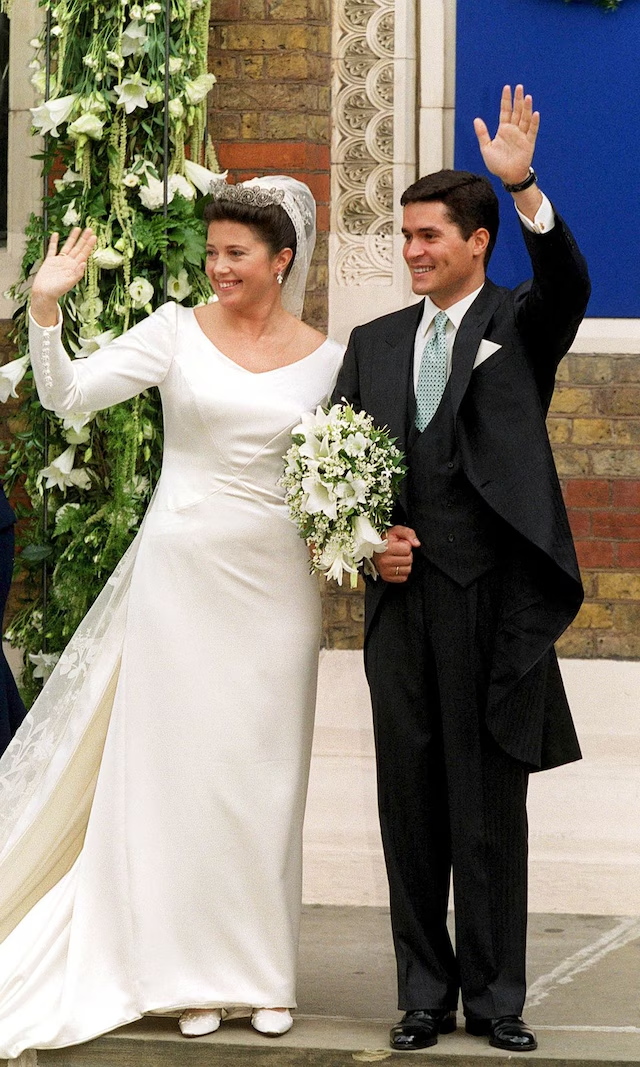 • El vestido: Diseñado por Inge Sprawson, sencillo, recto, con escote de pico, mangas largas y botones con abalorios. Llevó velo de encaje irlandés de su bisabuela Margarita de Connaught y tiara de Cartier con diamantes en espirales de laurel.