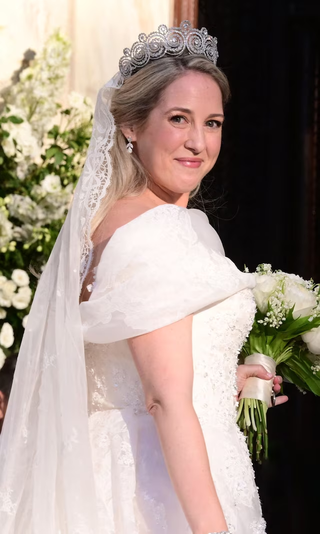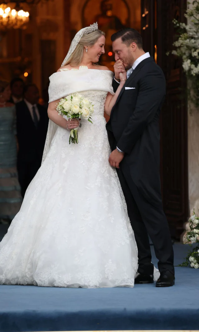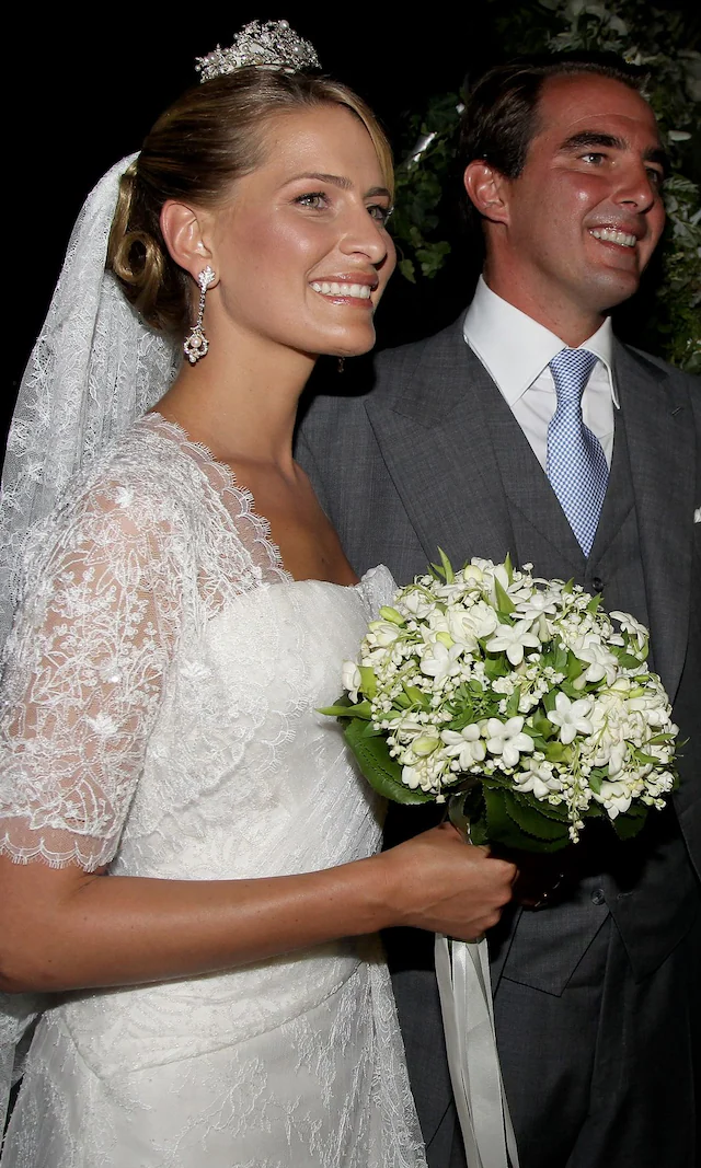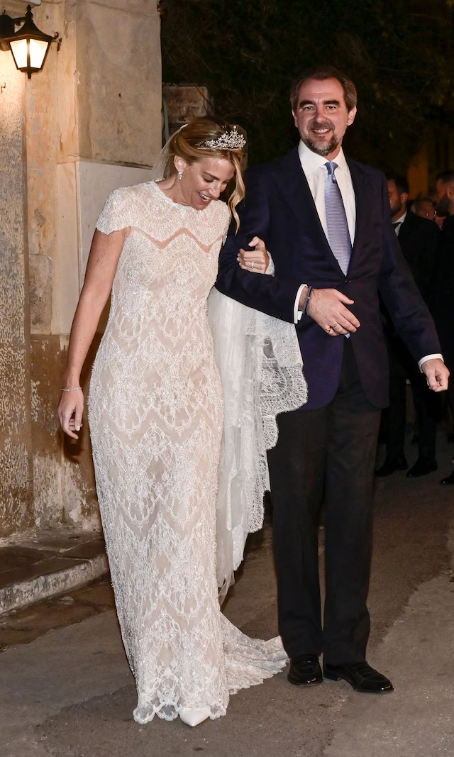 • El vestido: Hecho a medida por Costarellos, con escote redondo, mangas cortas, silueta recta y bordados intrincados en tul semitransparente. Velo de tul de seda a juego y tiara del Corsario, siguiendo la tradición familiar de nueras de Ana María de Grecia.