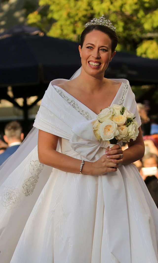 • El vestido: Imponente Valentino con falda tulipán, mangas largas y cuello cisne, trabajado durante cuatro meses con seda, bordados de perlas y encajes. Completó su look con la tiara del corsario, histórica pieza de la Casa Real griega.