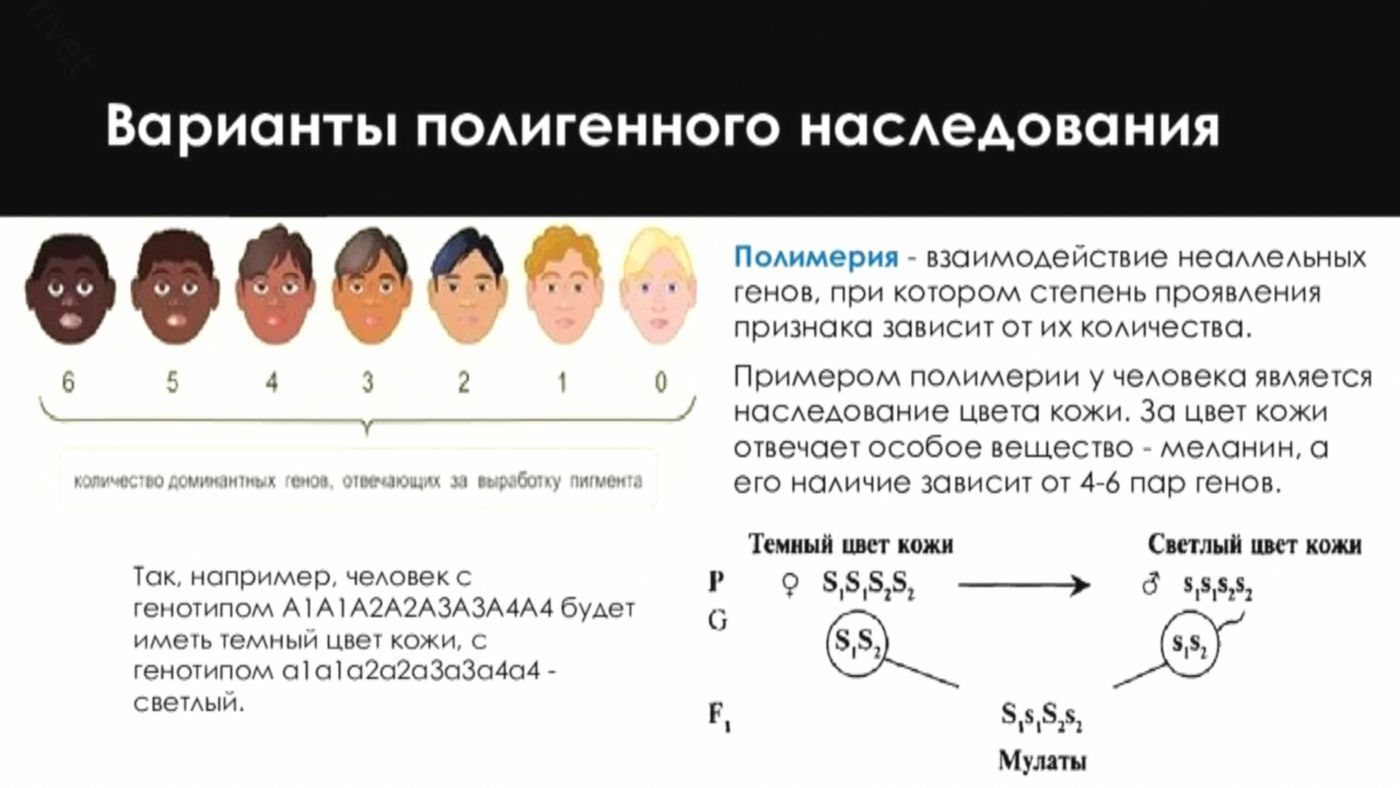 El color de la piel está controlado por varios genes, no por uno solo. Esto se llama herencia poligénica. Cuantos más variantes dominantes «oscuras» reciba el niño, más oscura será su piel. Cuantas más «claras», más clara será.